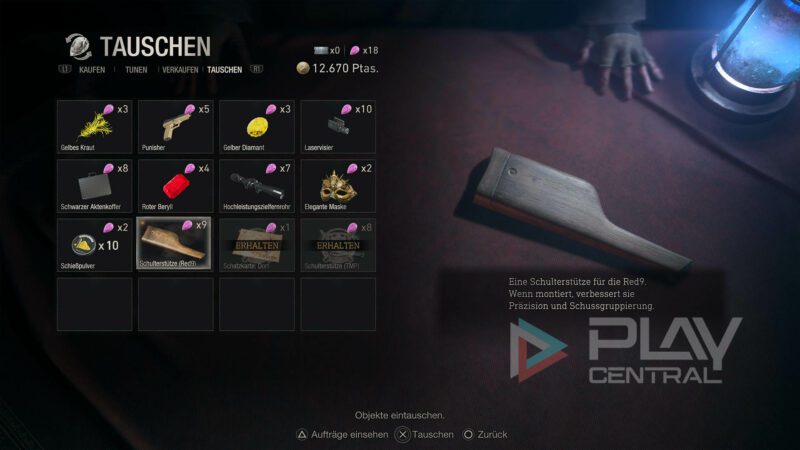 Diese könnt ihr direkt beim Händler ab Kapitel 5 tauschen, der nach der Bergvilla erscheint. Dafür benötigt ihr insgesamt 9x Spirelli. Die Schulterstützte ist also nicht unbedingt günstig, aber sie stabilisiert die Red9 ungemein, was eine große Hilfe im Kampf darstellt. Die Präzision und Schussgruppierung werden somit verbessert.
