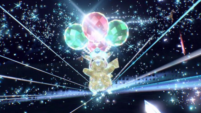 - Terakristallisierung: Dies ist quasi der Nachfolger von Giga-Dynamax oder den Mega-Entwicklungen aus vorherigen Teilen. Hierbei kristallisiert euer Pokémon und ändert womöglich seinen Typ. Somit könnt ihr zum Beispiel ein Pikachu mit dem Typ Flug kämpfen lassen. Zusätzlich bekommt es noch alberne Luftballons aufgesetzt. Nettes Feature, wobei ich Dynamax und vor allem die Mega Entwicklungen dann doch besser fand. Sehr cool: Zusätzlich gibt es überall in der Open World Tera-Raids, ähnlich wie die Dyna-Raids aus Schwert und Schild, bei denen ihr euch zu viert zusammentut und gegen ein Pokémon kämpft.