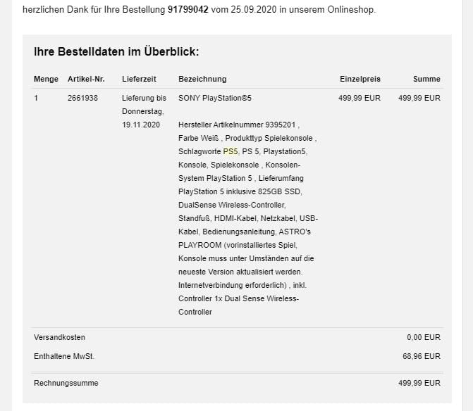 Eine zweite PS5, die wir über Saturn bestellt haben, ist bis jetzt nicht verschickt worden. Wir rechnen aber damit, dass die Versandbestätigung dafür heute oder zumindest in den kommenden Tagen verschickt wird.