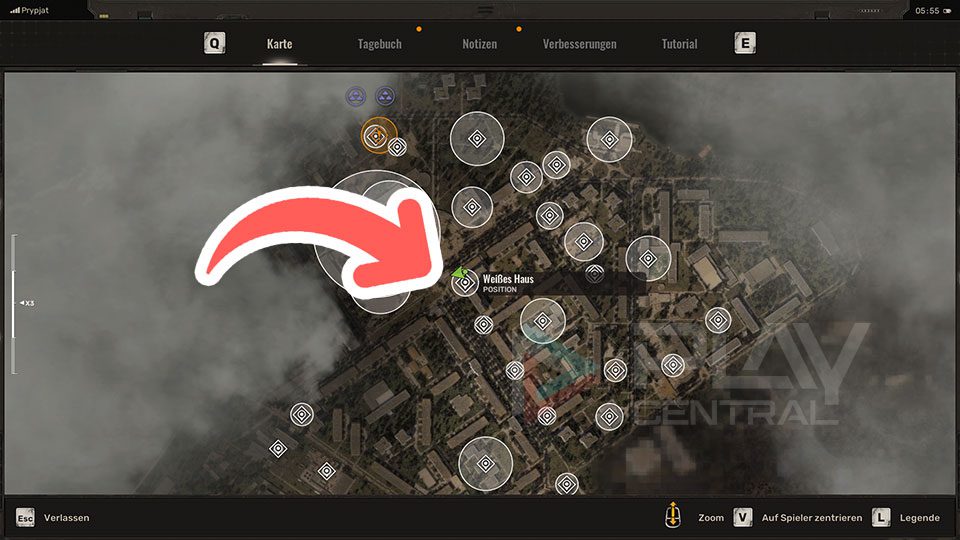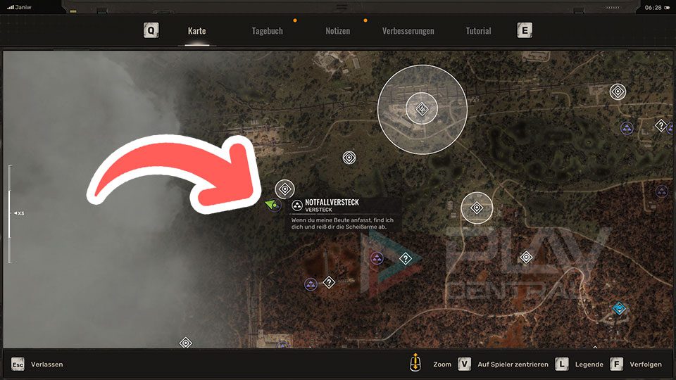 - Fundort: Verbrannter Wald, Pionierlager „Zauberland“ (Gebäude im Nordosten). Der kleine blaue Tresor befindet sich auf dem Dach. Nutzt die Leiter an der Außenwand, um nach oben zu gelangen.