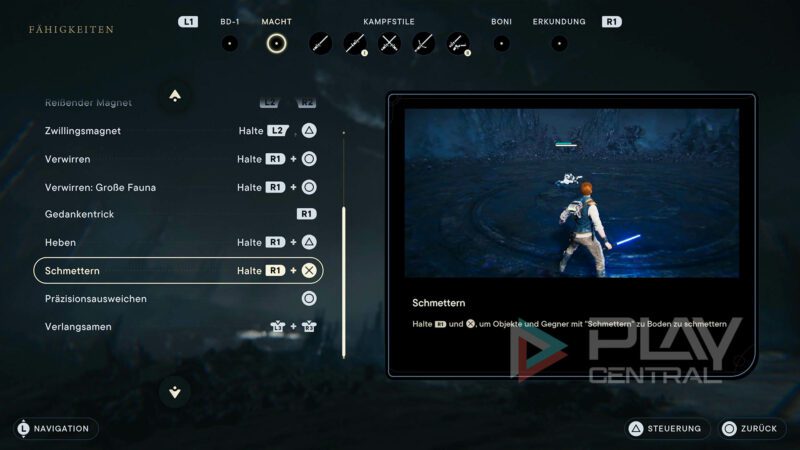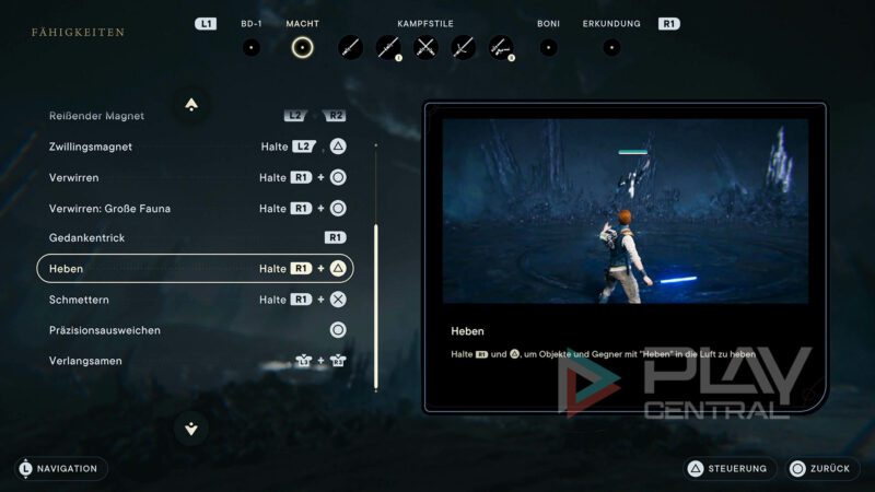 Drückt einfach R1 + Dreieck (PlayStation), um den entsprechenden Griff mit der Macht zu vollziehen. Einmal gelernt, ist es eigentlich ganz einfach.