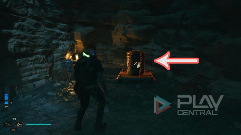 Außerdem gibt es Fässer mit Ketten. Diese Ketten könnt ihr mit Macht-Heben anheben und mit Macht-Schmettern sprengen (in dieser Reihenfolge). Diese Fässer zählen als Truhen und können euch bei den Sammelgegenständen helfen.