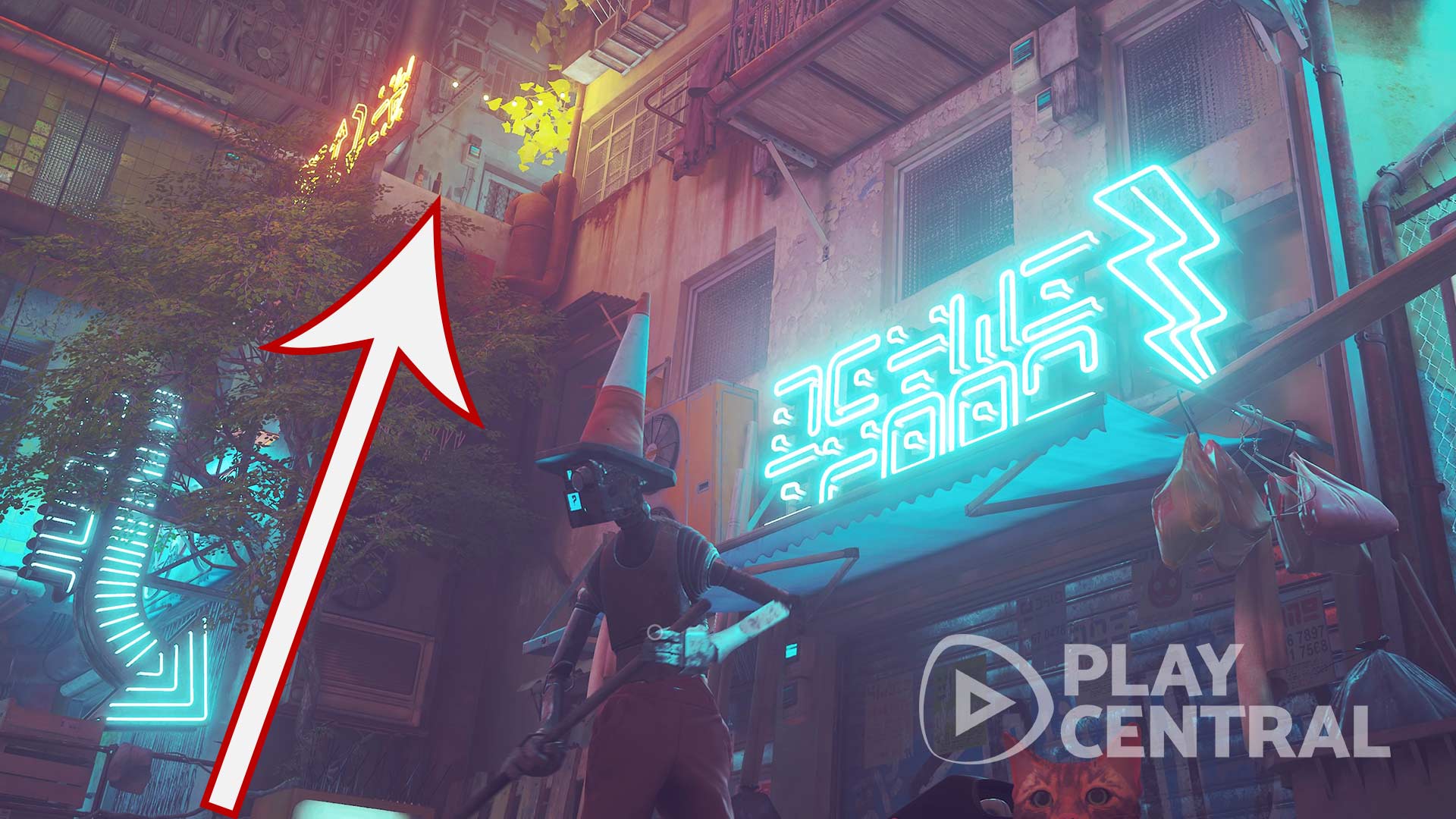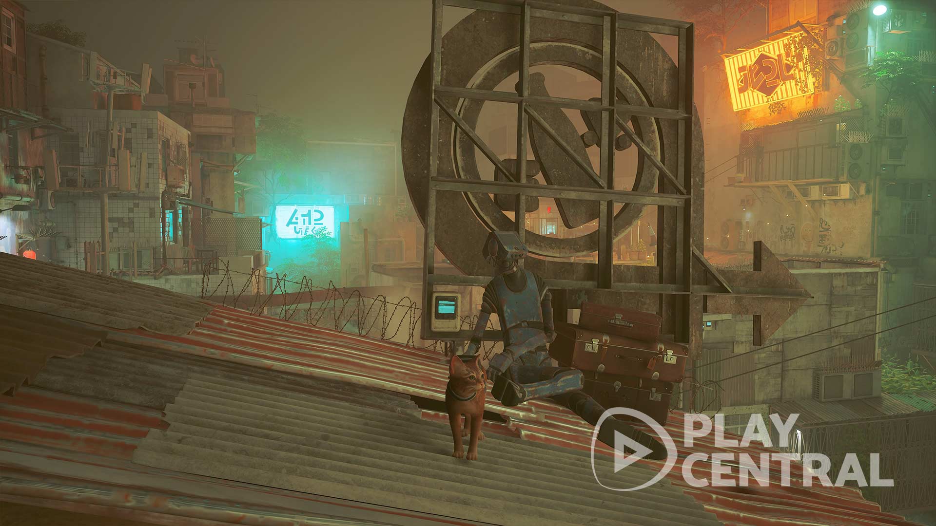 Die Slums (2/27): Steht ihr mit dem Rücken zum Wächter, klettert direkt an der linken Wand mit dem leeren Getränkeautomat bis ganz nach oben. Habt ihr das rote Dach mit dem kreisförmigen Pfeil erreicht, seht ihr dahinter einen Roboter neben einem Stapel Koffern liegen. Hier findet ihr die zweite Erinnerung.