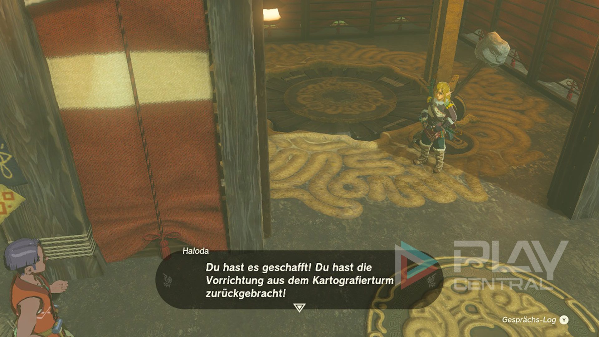 Schnappt euch jetzt die Vorrichtung und setzt diese unten im Turm an die entsprechende Stelle. Haloda wird den Turm nun reparieren, damit ihr im Anschluss den Teleporter wie gewohnt aktivieren könnt. Außerdem kann sich Link endlich in die Luft katapultieren lassen, um diese Region vollständig zu kartografieren.