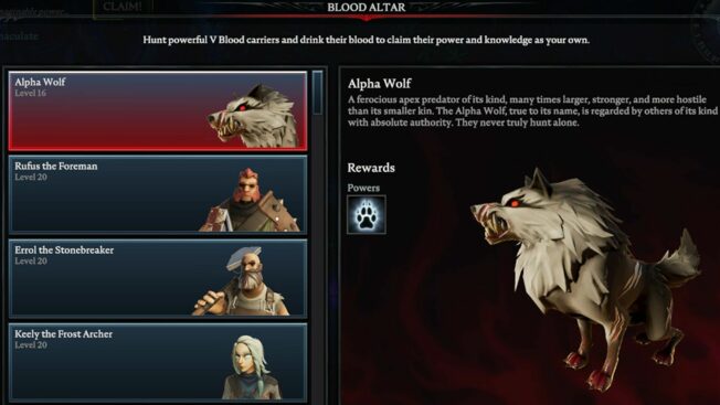 Der Alpha-Wolf ist der erste V Blood, dessen Blut ihr in V Rising aufspüren könnt und höchstwahrscheinlich der erste richtig harte Gegner, den Neulinge bekämpfen werden. Nehmt diese Kreatur nicht auf die leichte Schulter, denn dieser Wolf hat jede Menge Lebensenergie und verfügt über ein paar wirklich fiese Attacken.