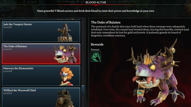 Diesem Boss in „V Rising“ solltet ihr nicht zu nahe kommen, da der übergroße Frosch euch sonst einfach verschluckt. Setzt stattdessen auf Angriffe mit der Armbrust und mit Chaosmagie, die Schaden über Zeit anrichtet. Bleibt dabei aber in Bewegung, da der Herzog viele Bereichsattacken beschwören kann und wird.