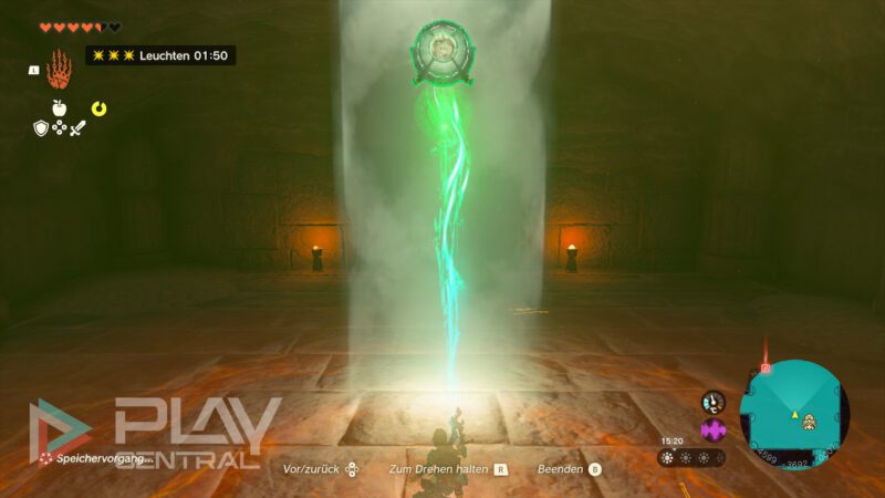 Um den Energiespeicher nun aufzuladen, müsst ihr nicht viel mehr tun als das, was ihr sowieso schon die ganze Zeit macht. Aktiviert die Kraft von Riju und, sobald diese sich aufgeladen hat, schießt mit einem Pfeil auf den Energiespeicher im Zentrum des Raums. Der Speicher wird aufgeladen und ihr könnt euch auf die Suche nach dem zweiten Speicher begeben.