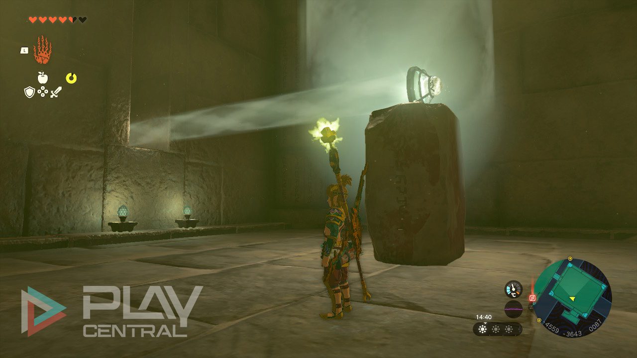 Im nächsten Raum macht ihr das gleiche nochmal, nur dieses Mal stellt ihr den Steinfelsen hochkant, damit er so groß wie nur möglich ist und Link unter den Stacheln hindurch laufen kann. Erledigt das Konstrukt auf der anderen Seite und springt dann in den Bereich unter euch, wo ihr im Donnertempel ein kleines Licht-Rätsel lösen müsst.