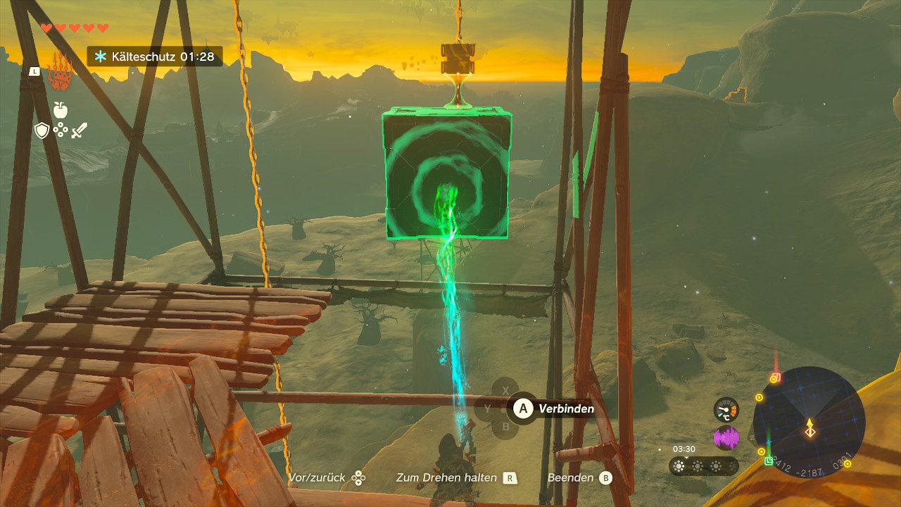 Aktiviert eure Ultra-Hand und wählt die große Holzkiste aus, die ihr nun direkt zum Aufzug tragt. Ganz oben, links von dem Seil, welches die Plattform am unteren Ende hält, befindet sich eine Möglichkeit, ein Gegengewicht anzubringen. Verknüpft dort Kiste und Winde miteinander, damit der Aufzug nach oben schnellt und der Arbeiter sein Werk verrichten kann.