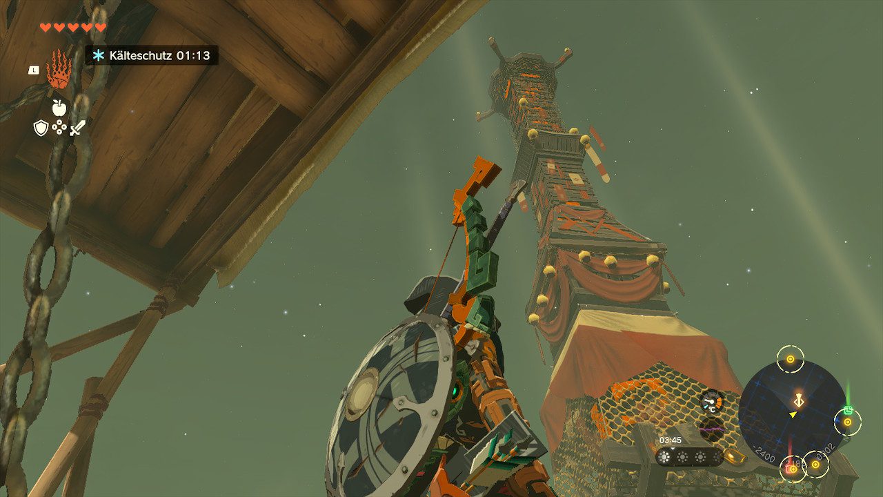 Es gibt zwei Wege, den Gerudo-Turm zu erreichen, einen Schnellen und einen Langsamen. Der schnelle Weg erfordert etwas Ausdauermedizin beziehungsweise -Proviant und vielleicht auch ein klein wenig Mut, denn ihr müsst euch im Turm in der Ebene von Hyrule nach oben schleudern lassen und dann via Schirm nach Südwesten gleiten.