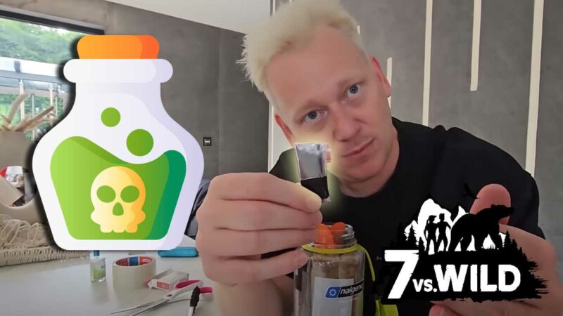 Knossi und Sascha haben beim Packen ihrer 7 vs. Wild-Flasche ein paar besondere Gegenstände eingepackt. Dazu zählen unter anderem die zahlreichen Micropur Tabletten. Mit den kleinen weißen Pillen haben die beiden Lufträume in ihrer Flasche aufgefüllt.