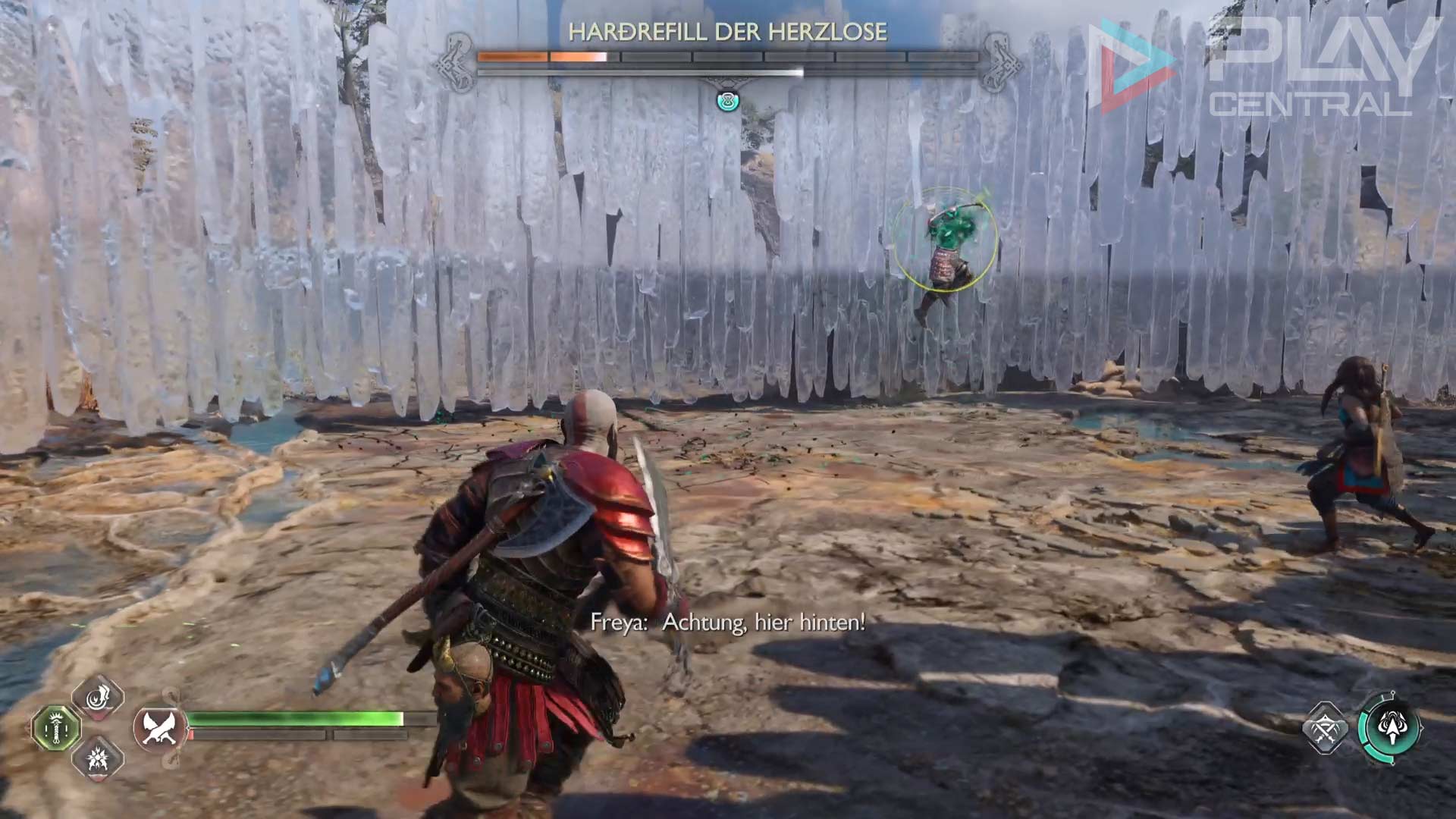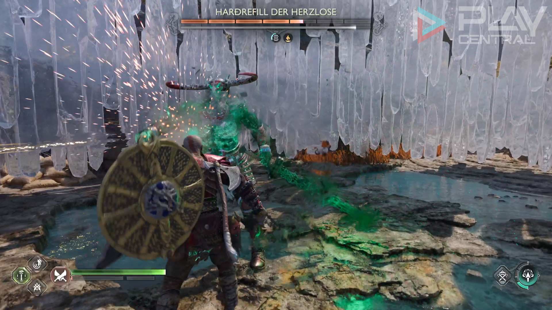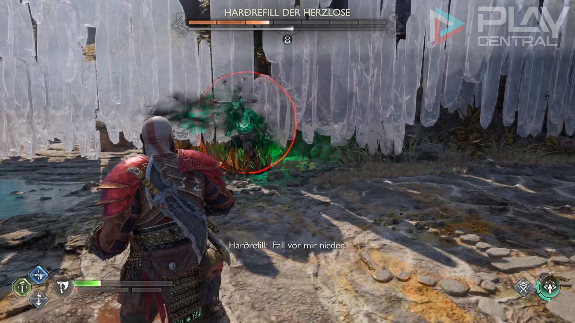 Unvorbereitet ist vor allem der mächtige Sprungangriff von Hardrefill besonders fies. Zu Beginn habt ihr leider keine Zeit, um selbst ersten Schaden auszuteilen. Stattdessen wird der Berserker mit einem roten Angriff weit über Kratos Kopf in die Luft steigen, nur um kurz danach zurück auf die Erde zu krachen. Der Aufprall verursacht in einem kleinen Radius Schaden, weshalb wir euch keine Ausweichrolle empfehlen. In den meisten Fällen werdet ihr dennoch getroffen und erhaltet massiven Schaden.