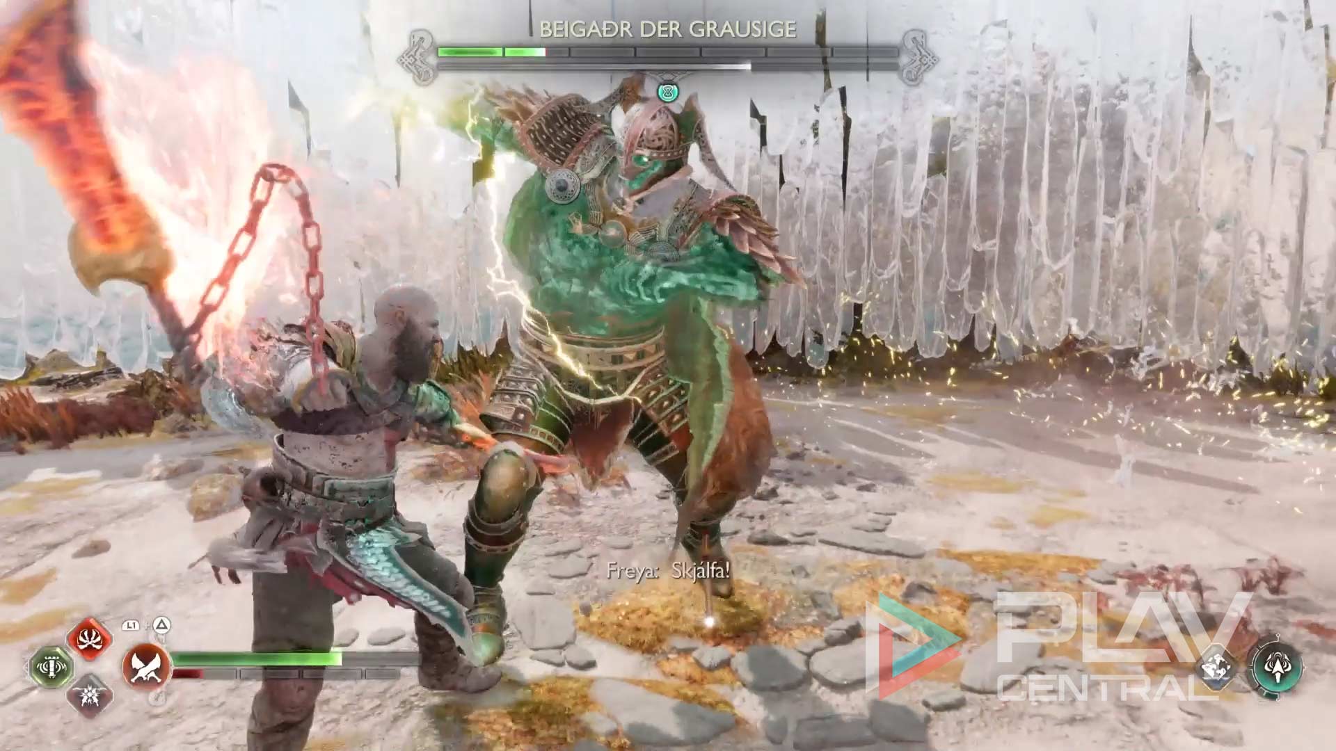 In diesem Kampf müsst ihr euch vor allem mit Blitzangriffen auseinandersetzen, die Kratos schnell das Leben kosten können, wenn ihr nicht konzentriert bei der Sache seid. Geht Beigardr in den Nahkampf, schleudert er euch seine Fäuste entgegen, die von Blitzen umgeben sind. Solche Angriffe könnt ihr blocken und parieren. Auch Fernkampfangriffen am Boden, die sich euch schnell nähern, könnt ihr bequem das Schild entgegenstellen.