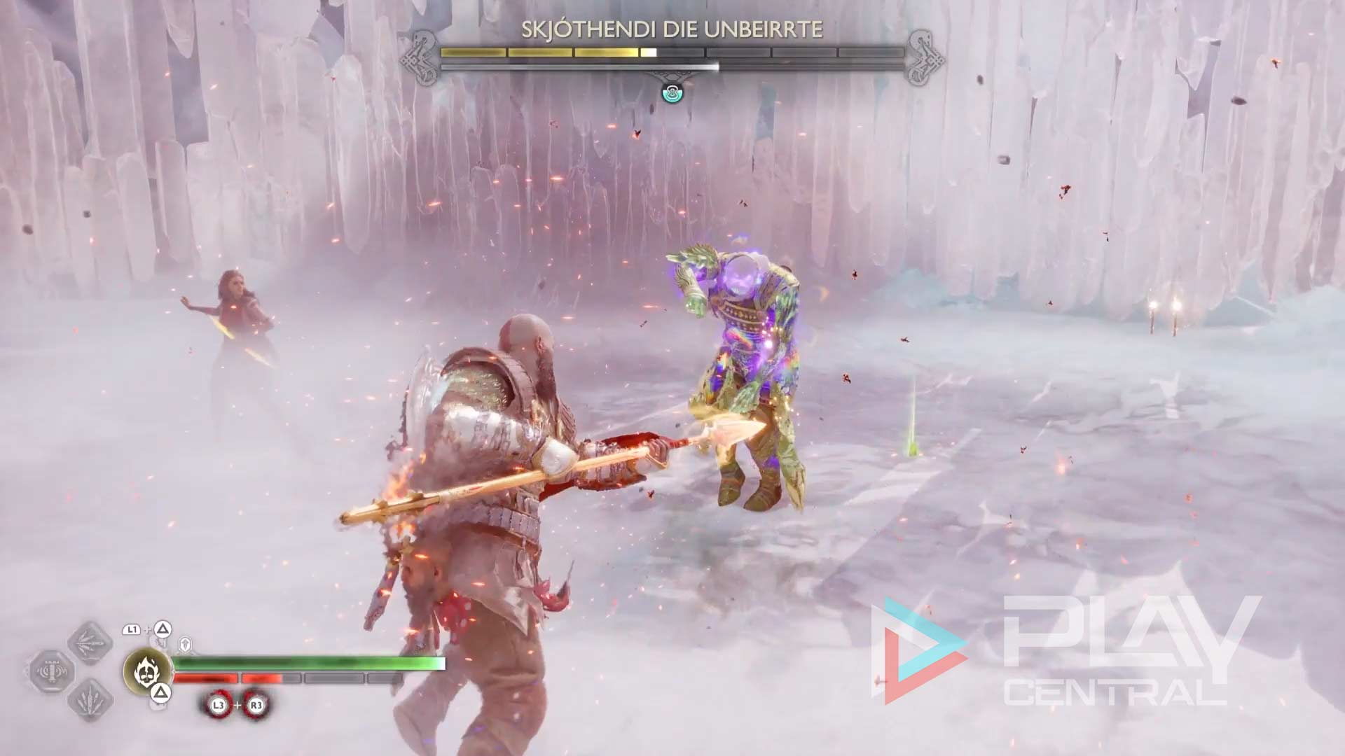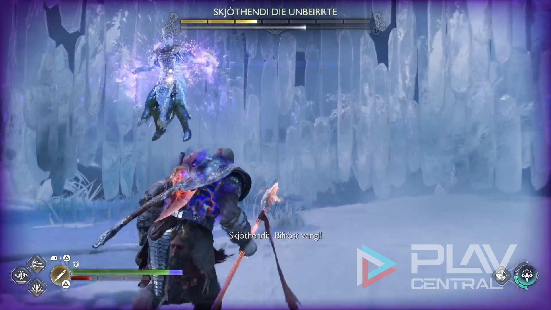 Bei diesem Kampf besteht die Besonderheit darin, dass ihr es pausenlos mit fiesen Bifröst-Attacken zu tun bekommt. Es gibt verschiedene Möglichkeiten, um diesen Statuseffekt von Kratos wieder loszubekommen, generell würden wir euch aber empfehlen, den Kampf möglichst schnell zu beenden.
