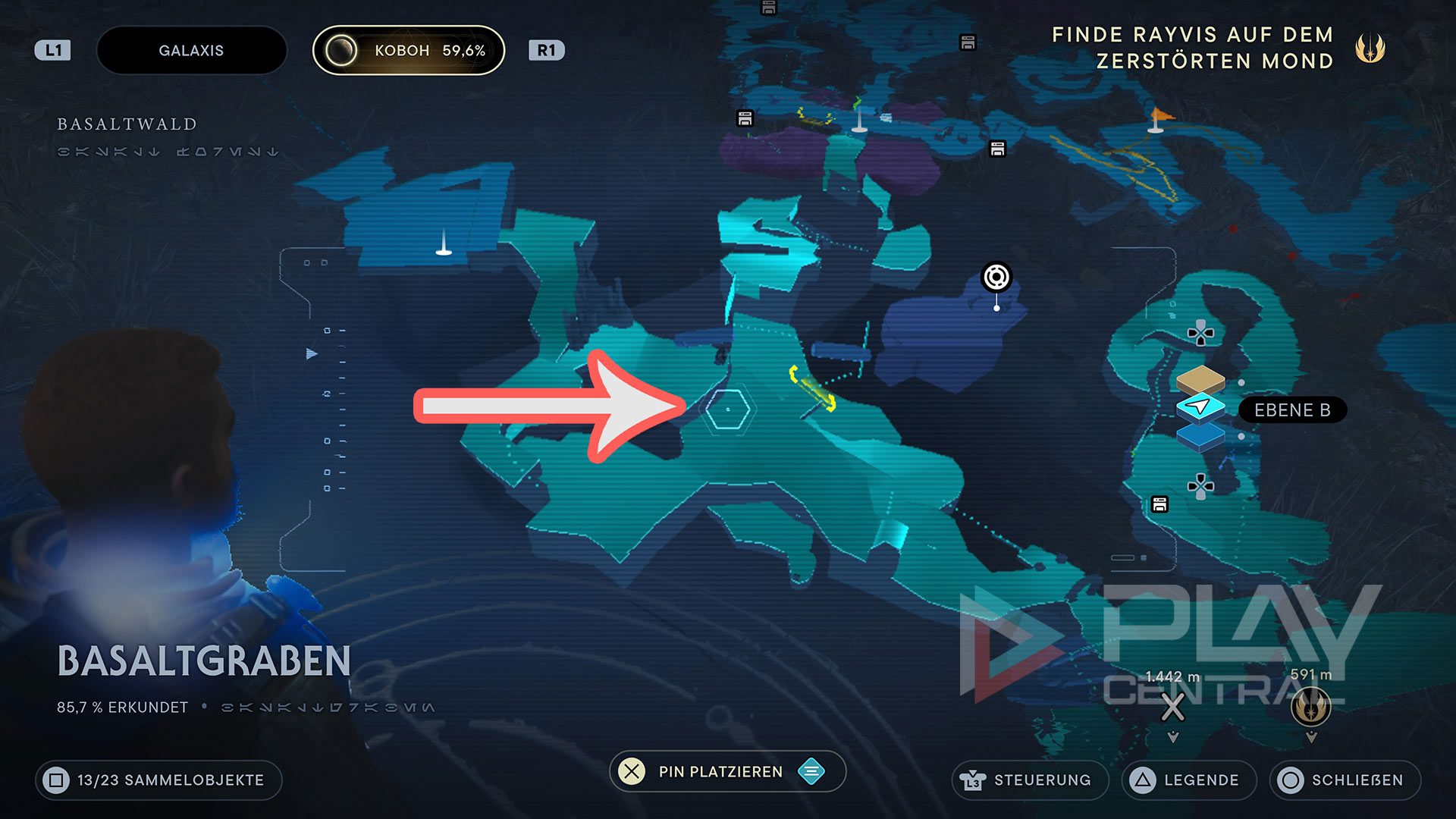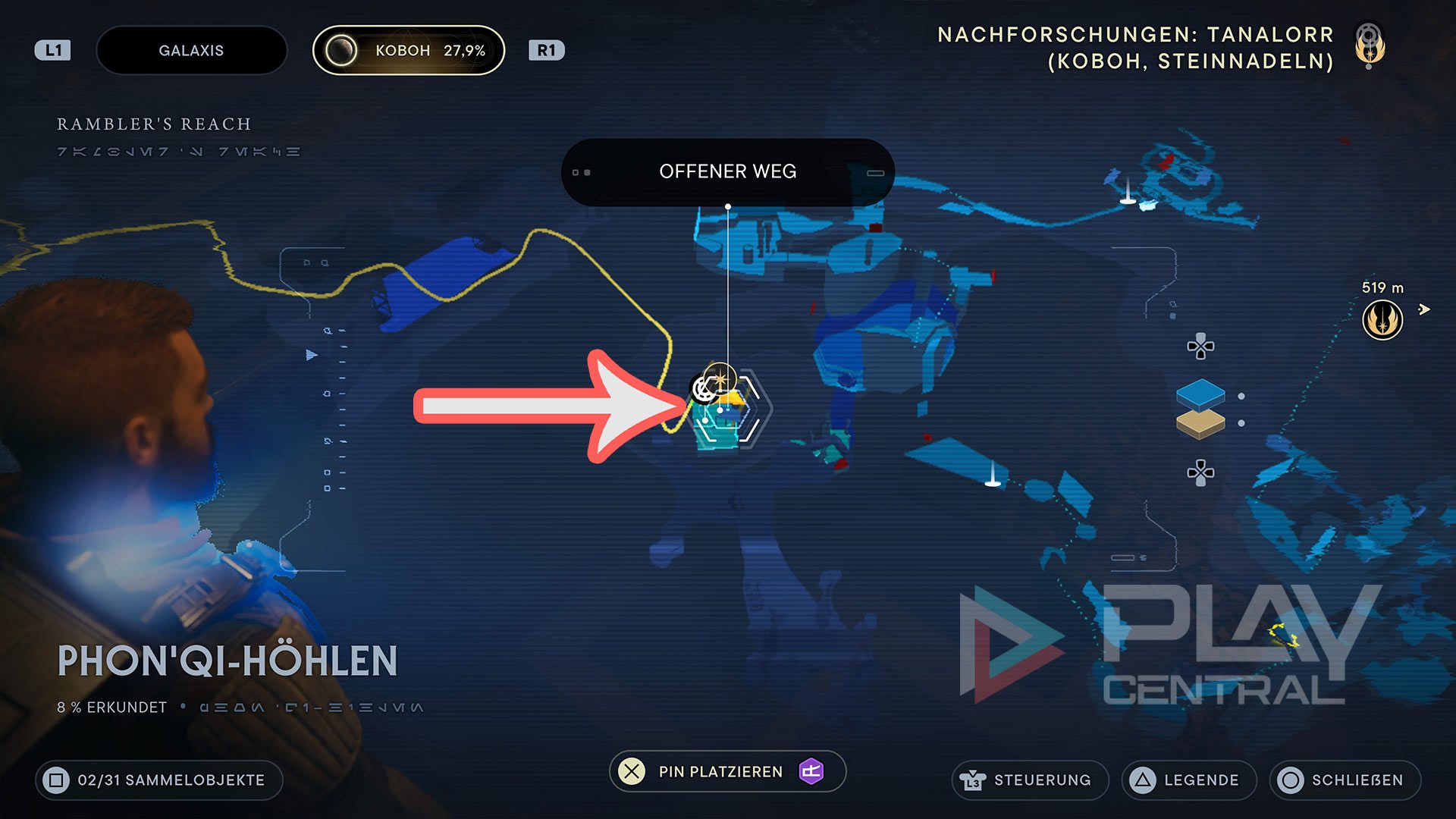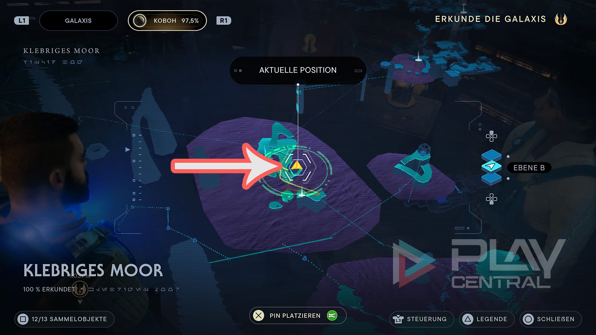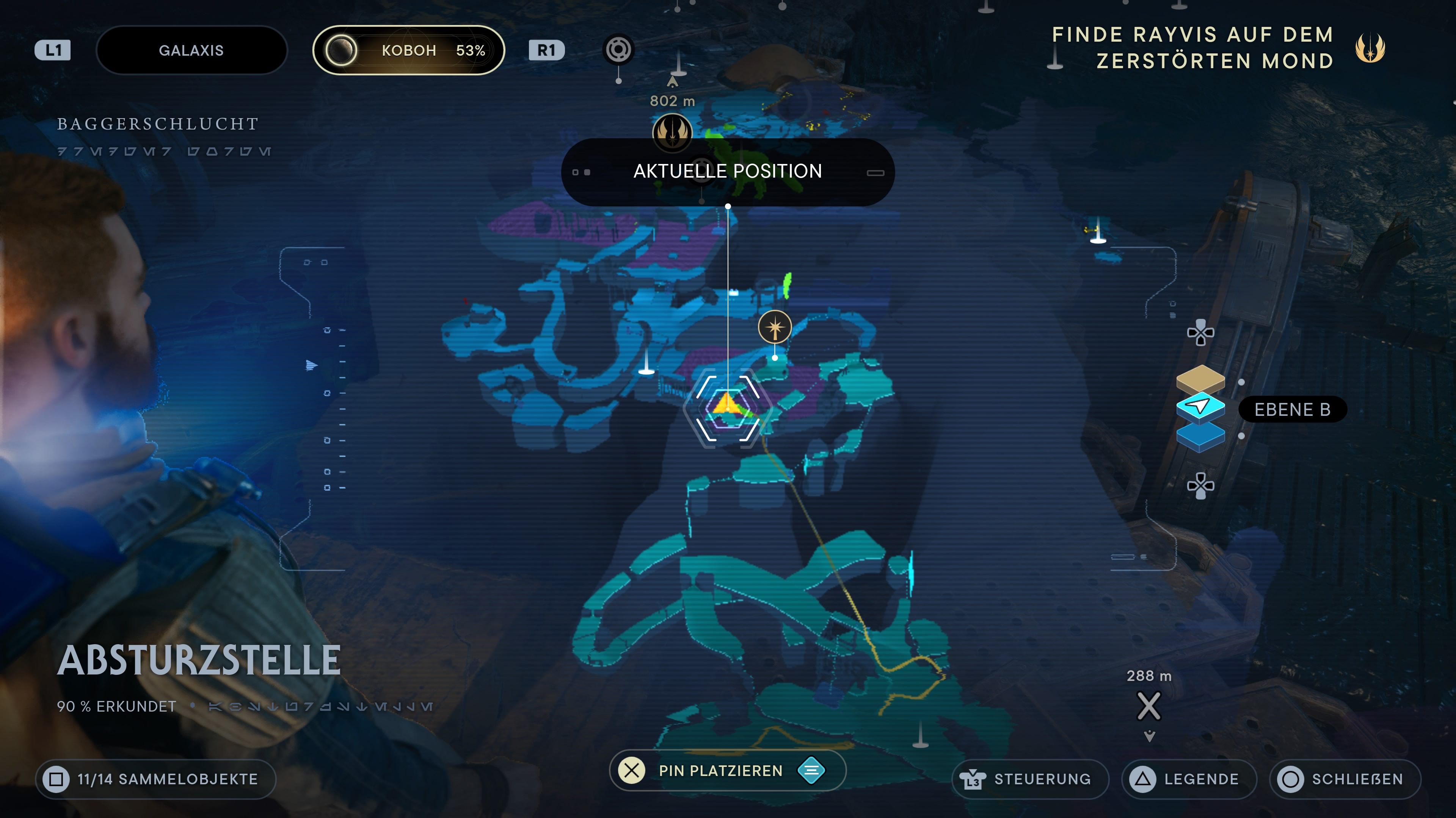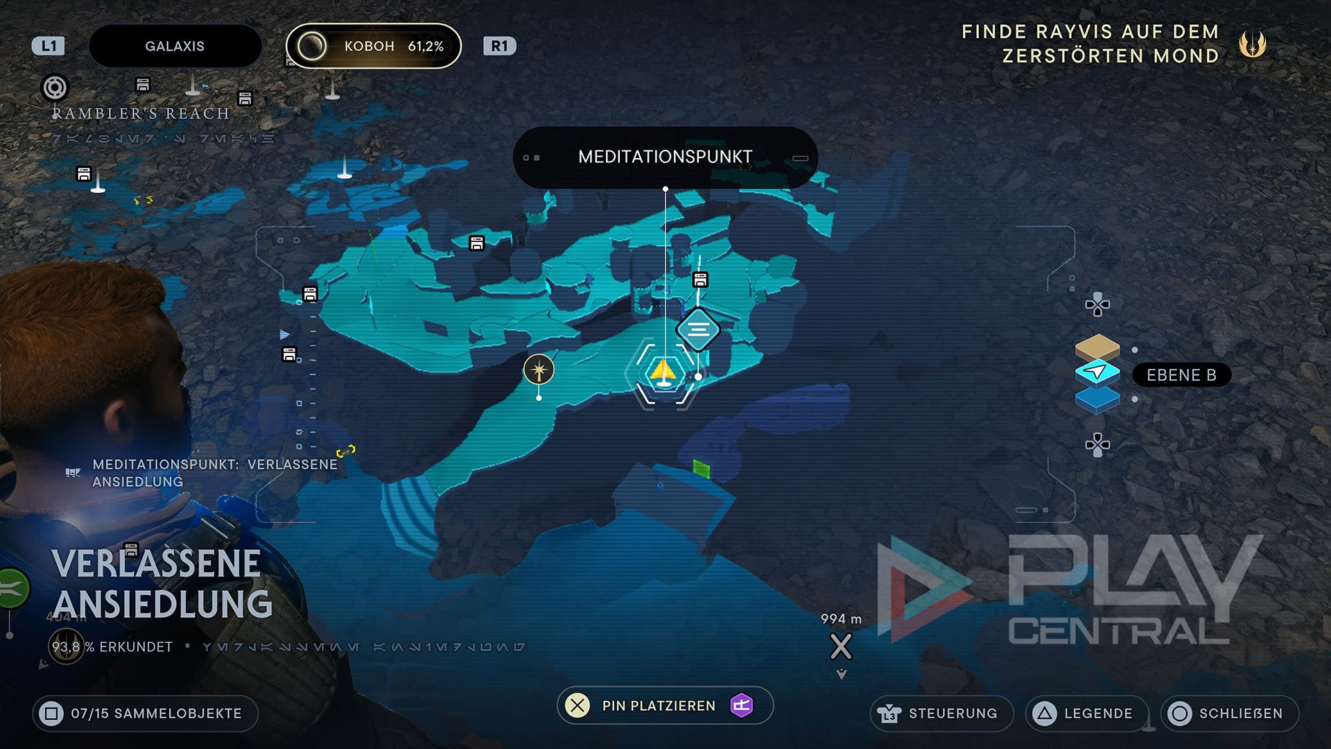 Sobald ihr die Fähigkeit erlernt habt, könnt ihr Zygg dabei helfen ihr Datapad zu finden. Zum Glück befindet sich dieses nicht unweit eures Standorts. Direkt neben der Hütte könnt ihr einen großen Felsen aus dem Moor nach oben ziehen. Springt an die daran befestigten Gitter und klettert bis ganz nach oben. Springt im Anschluss auf das Felsplateau mit dem Meditationspunkt. Jetzt könnt ihr die Plattform, von der ihr gerade herübergesprungen seid, erneut nach oben heben. Springt dann wieder an die Gitter und klettert erneut nach ganz oben. Da ihr jetzt ein gutes Stück höher seid, gelangt ihr auf die Plattform auf der anderen Seite.