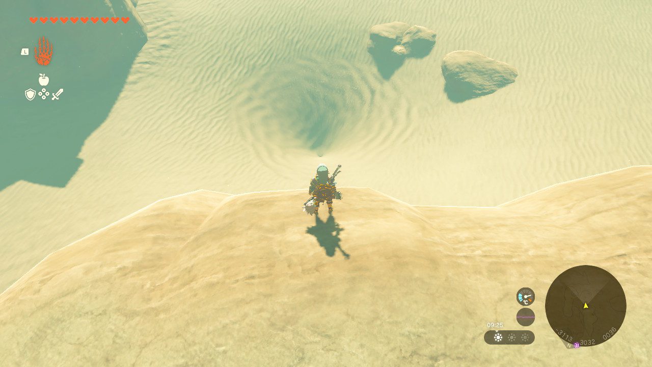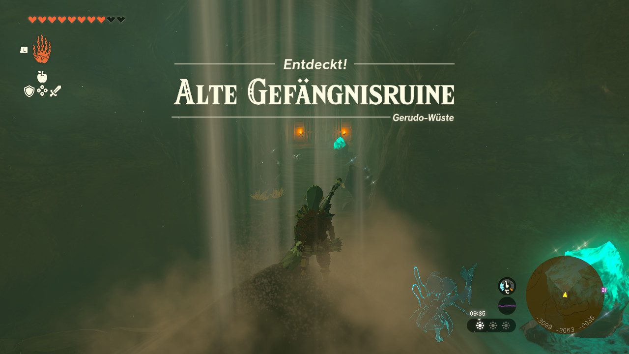Habt ihr die Perlen-Einöde erreicht, seht ihr neben dem Felsen einen Sandstrudel, in welchen es zu springen gilt. So gelangt Link in die Gefängnisruine unter der Gerudo-Wüste, wo es in erster Linie zwei Dinge gibt: Viele Erzvorkommen, die ihr mit der richtigen Waffe zerbrechen könnt, um euren Vorrat aufzustocken, und die zombieähnlichen Gibdos.