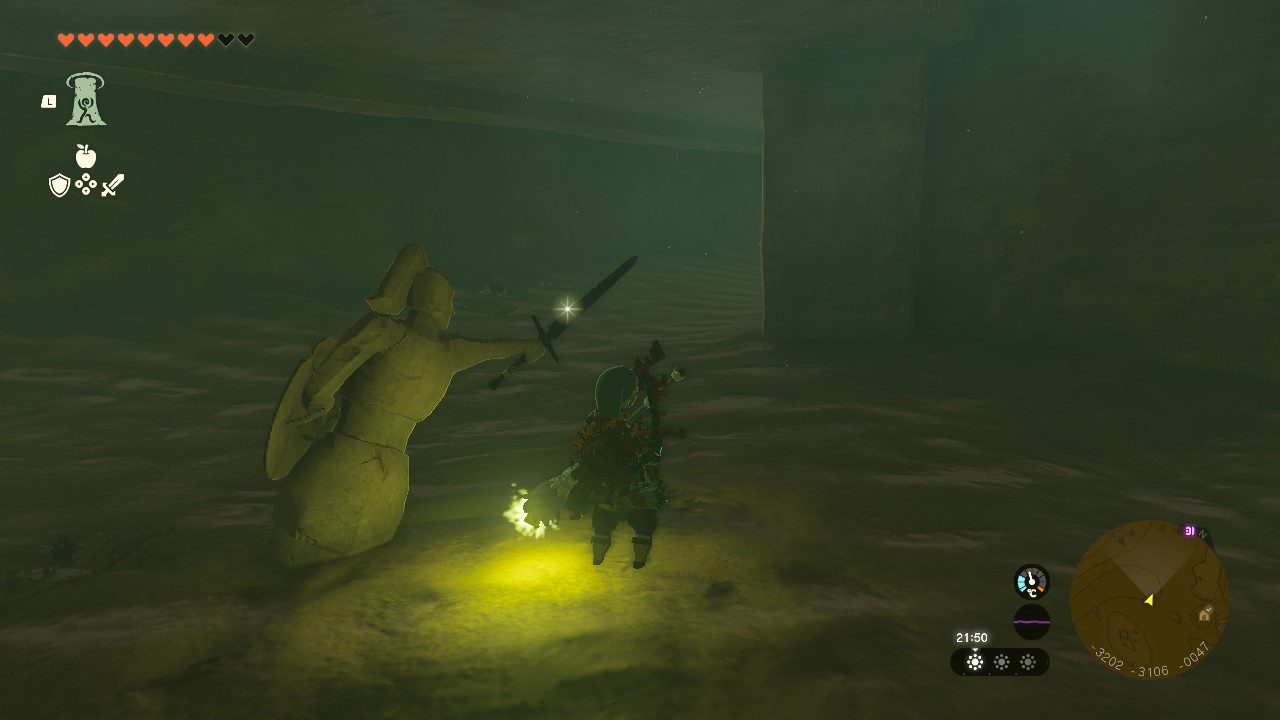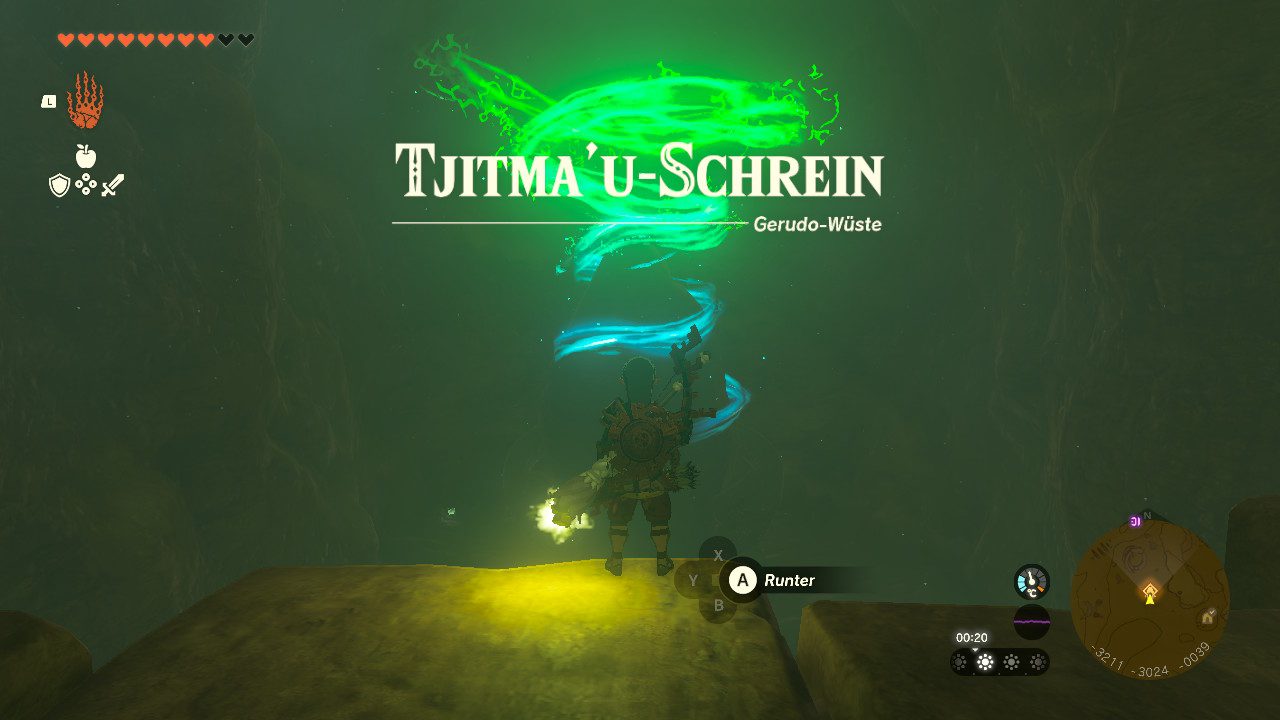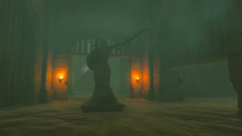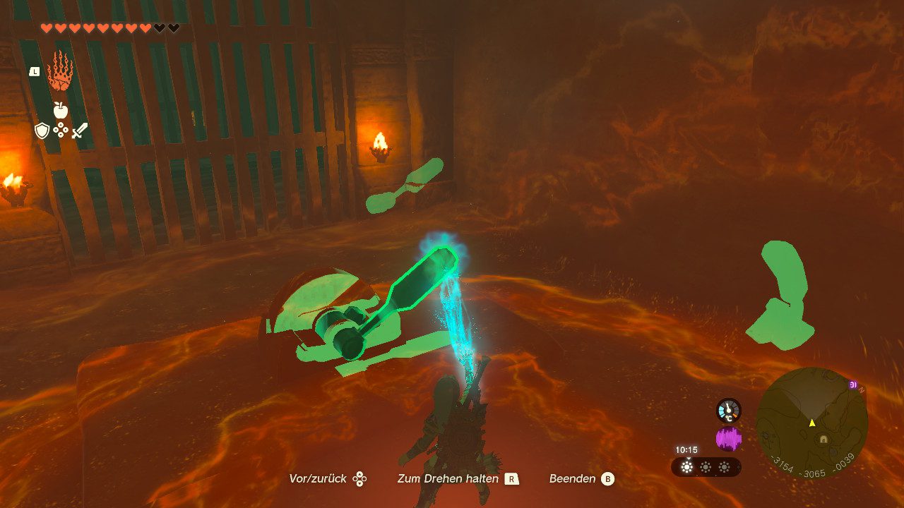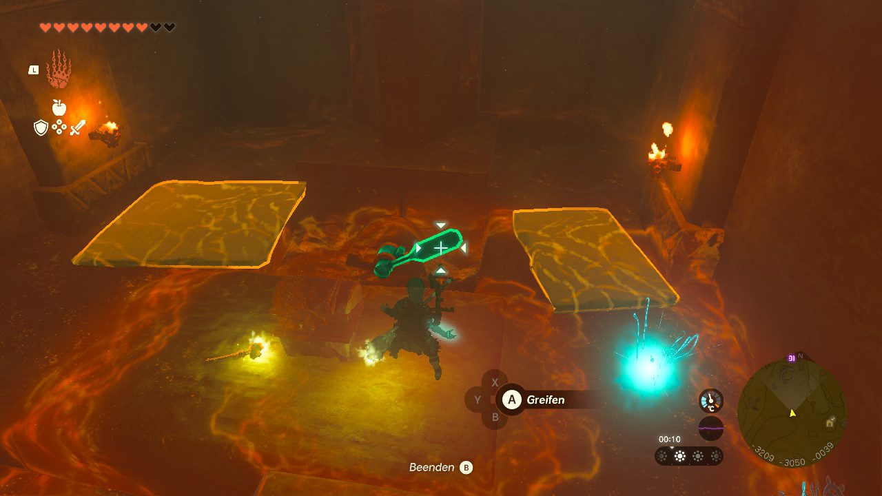 Direkt hinter dieser Truhe könnt ihr zwei Bodenplatten mit der Ultra-Hand entfernen, um einen Hebel freizulegen. Bedient ihr eben diesen Hebel, wird ein geheimer Weg frei, der euch direkt zum Tjitma’u-Schrein führt. Da es sich bei dem Schrein um einen von Raurus‘ Segen handelt, braucht ihr zum Glück auch kein weiteres Rätsel lösen.