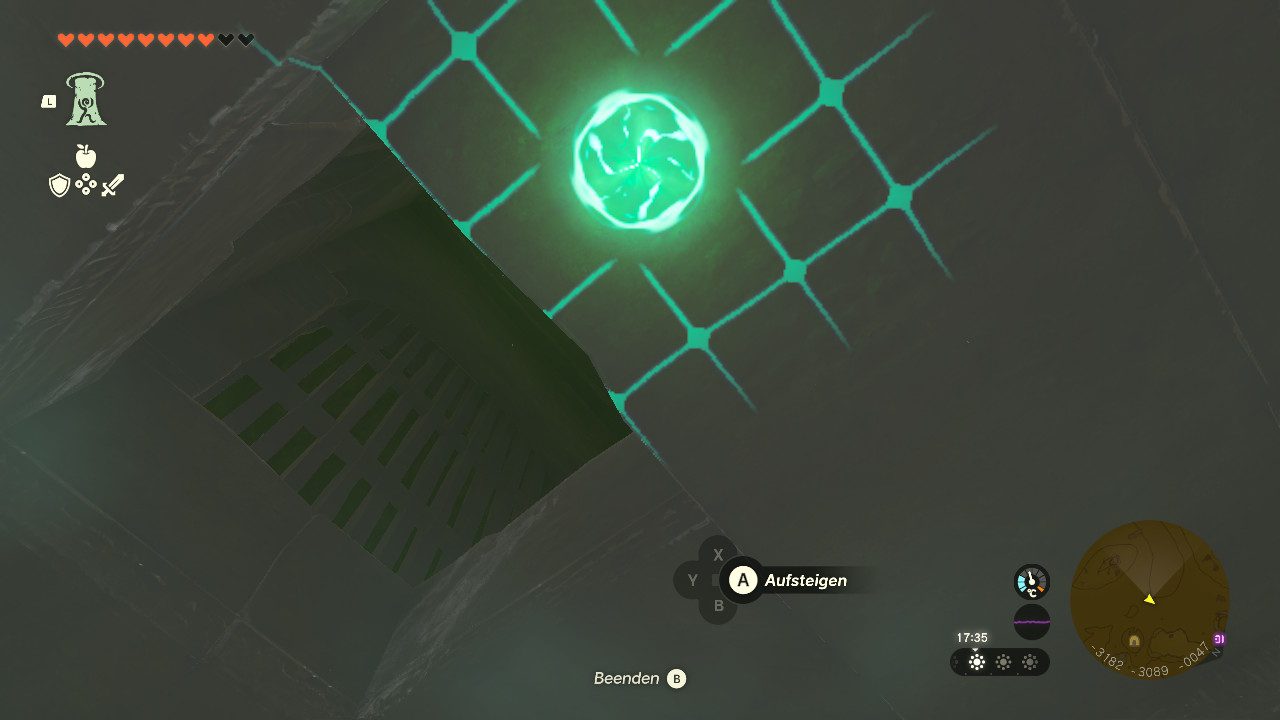 Folgt dem von der Statue angedeuteten Weg nach Norden und legt auch dort einen Hebel mit der Fähigkeit Ultra-Hand um, wodurch sich links und rechts jeweils ein Gitter öffnet. Links erscheint ein weiterer Gibdo, rechts geht es in Richtung Schrein. Lasst euch also rechts nach unten fallen und duckt euch, um unter der tiefen Decke durchzukriechen.