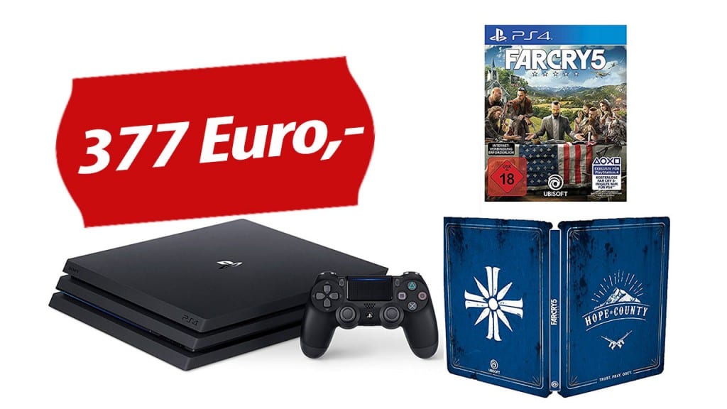 Der heutige Montag ist der letzte Tag der Oster-Angebote-Woche auf Amazon. Ein besonders lohnendes Angebot dreht sich um Sonys PlayStation 4 Pro, die der Onlineversandhändler im Bundle samt Ubisofts First-Person-Shooter Far Cry 5 (erscheint am 27. März) für günstige 377 Euro (plus 5 Euro Versand) anbietet. Dabei handelt es sich um die PS4 Pro mit 1 Terabyte Speicherplatz in der Standard Edition. Der Normalpreis für die 4K-Konsole liegt bei 399 Euro, während Far Cry 5 für die PS4 mit rund 60 Euro zu Buche schlägt.