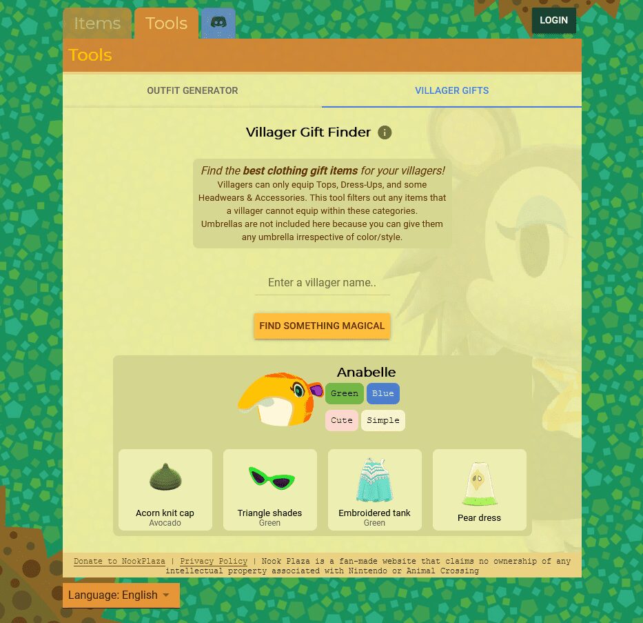 Um das Tool zu benutzen, sucht die Seite von Nook Plaza auf und klickt dort auf Tools. Wechselt dann zu dem Tab Villager Gift (Dorfbewohner-Geschenke) und gebt etwas weiter unten den Namen der Person ein, die ihr beschenken wollt. Auf diese Weise erhaltet ihr eine Übersicht über die Vorlieben des Charakters und welche Kleidungsstücke sich perfekt als Geschenk eignen. Sollte euch die Auswahl warum auch immer nicht gefallen, klickt anschließend auf Find something magical (Finde etwas Magisches), um eine neue Auswahl an potenziellen Geschenken zu erhalten.