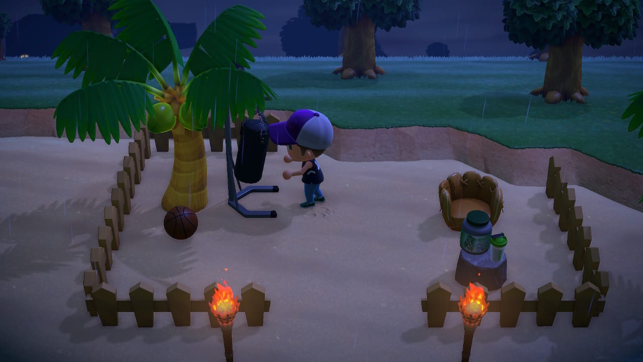 „Animal Crossing: New Horizons“ setzt diese Prämisse sogar fort. Endlich lassen sich Items und Möbel auch außerhalb der eigenen vier Wände aufstellen. Ich habe mir zum Beispiel am Strand einen kleinen Sportbereich zusammengestellt mit Boxsack und Basketball.