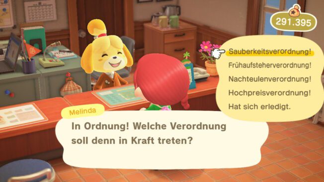Sobald ihr die Voraussetzungen erfüllt, könnt ihr jederzeit in euer Servicecenter gehen und dort mit Melinda reden. Sie hat ab sofort eine neue Option unter der Insel-Verwaltung, die euch die Verordnung auswählen lässt.