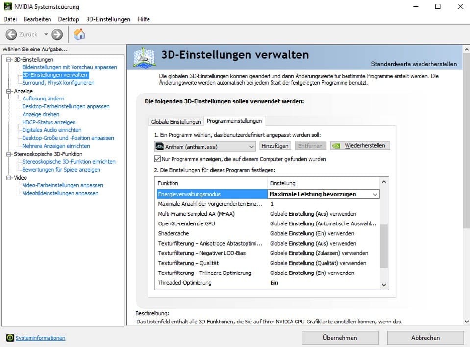7. Hier stellt ihr 'Energieverwaltungsmodus' auf 'maximale Leistung bevorzugen' oder 'Maximale Anzahl der vorgerenderte Einzelbilder' auf den Wert 1!