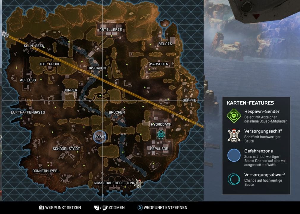 Das gilt auch für die Landung: Größere Gebiete wie die Kaskaden, Brücken oder die Luftwaffenbasis sind ein beliebtes Ziel. Wollt ihr auf Nummer sicher gehen, solltet ihr euch lieber für ein Gebiet wie die Slum-Seen, Sümpfe oder Relais entscheiden. Werft am besten immer direkt einen Blick auf die Übersichtskarte: