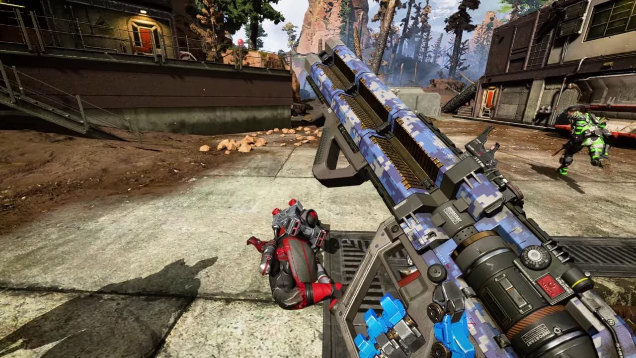 Auf einem Bild sehen wir Schmalzlocke Mirage, der eine Waffe auf seinem Rücken transportiert. Allerdings sieht diese Knarre keiner Waffe ähnlich, die es derzeit in „Apex Legends“ gibt. Da es sich jedoch nur um kleine Bildausschnitte handelt, fällt es schwer auszumachen, um was es sich dabei genau handelt.