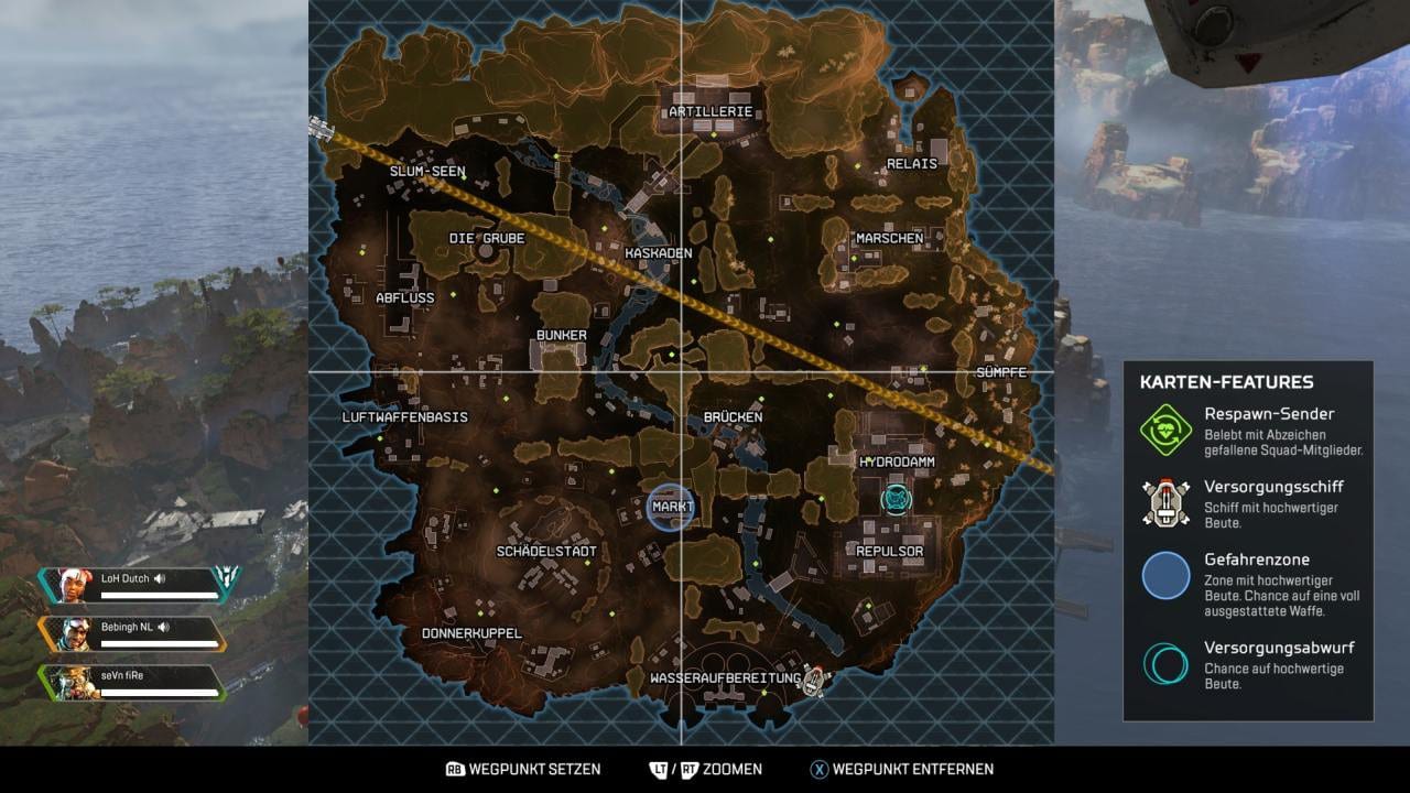 Diese auf der Karte blau markierten Gebiete warten, genau wie das Versorgungsschiff, mit besonders hochwertiger Beute auf und da Spieler allgemein ziemlich gierig sind, springen die meisten bei „Apex Legends“ in genau diesen Gebieten ab – und sterben dabei innerhalb der ersten Spielminuten.
