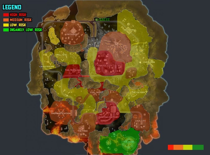 Bei den gelben Bereichen handelt es sich übrigens um Orte, wo häufig keine Spieler vorzufinden sind oder um Orte, die lediglich durchlaufen werden, um zu den wichtigen Punkten zu gelangen. Deshalb ist die Wahrscheinlichkeit auch sehr hoch, auf entspannte Kämpfe gegen ein einzelnes feindliches Squad zu treffen. Im Ranked-Modus fliegen die Spieler häufig zu Lava Fissure, Drill Site, The Geyser, Overlook oder Refinery, um sichere Beute zu ergattern.