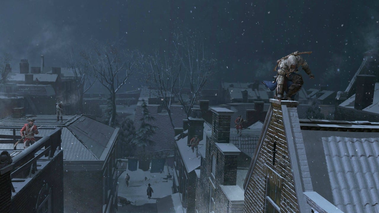 Um mich unter dem „smooth“-Titel einem schlechten Wortwitz hinzugeben – flüssiger Dargestellt war ein Assassine noch nie. Die Animationen haben einen definitiven Schritt nach vorne gemacht. Wobei das Rad natürlich nicht neu erfunden wurde. Zudem beschränkt sich dieses Lob auf den Hauptcharakter und Protagonisten Connor. Die Nebendarsteller und Passanten wirken wie zuvor eher holzig und stellenweise entweder emotionslos oder verfallen grausamen Overacting (ja das ist möglich!). Unsere Assassinenrothaut ist hingegen flüssig und agil wie man es sich nur wünschen kann und hoppelt quickfidel von Häusersims zu Häusersims und Ast zu Ast als wenn es ein leichtes wäre – so macht Klettern definitiv Spaß! Doch nun genug Schabernack für einen Nachmittag – eine Revolution schlägt sich gewiss nicht von selbst und schon gar nicht ohne uns. Wir haben in diesem Artikel ganz bewusst (auch Redakteure haben faule Tage) auf eine Aufbereitung der Geschichte verzichtet.