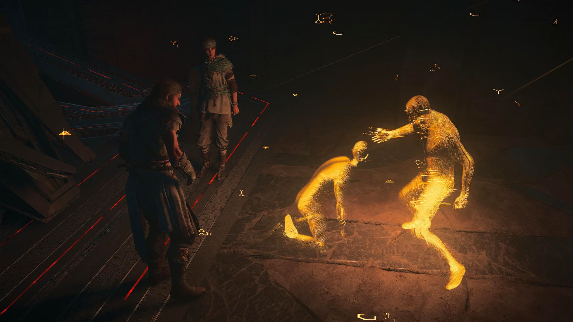 Was zeigt das Hologramm? Nehal aktiviert in dieser Sequenz von „Assassin’s Creed Mirage“ schließlich noch einen Isu-Gegenstand, der eine Hologrammaufzeichnung startet. Darin sehen wir, wie ein Isu von einem anderen gefoltert wird. Es zeigt Basims Erinnerungen aus seiner Zeit in Gefangenschaft als Loki.