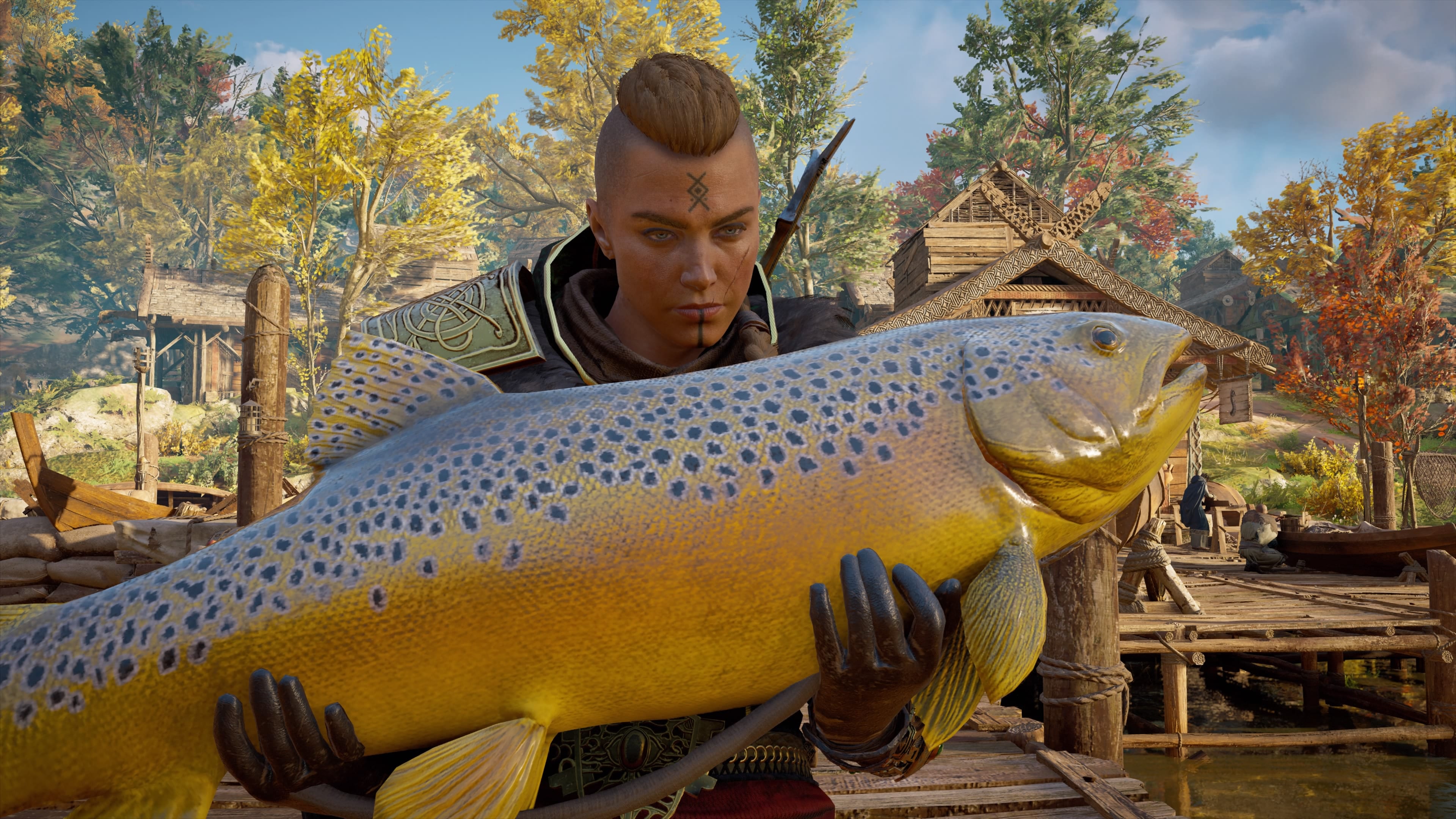 Rüstet nun eine Zweihandaxt, einen Speer oder eine andere zweihändige Waffe aus und reist nach Nordwic in East-Engla. Dort werdet ihr Gewässer finden, in denen Eivor stehen kann und in denen es vor Fischschwärmen nur so wimmelt. Sucht nun mit Odins Sicht nach großen Fischschulen und attackiert diese mit eurer Zweihandwaffe, wodurch die Tiere leicht zu töten sind und ihre Überbleibsel dank Automatisch plündern direkt in euren Besitz übergehen.
