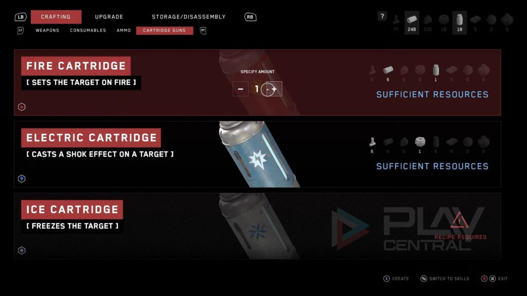 Zuvor solltet ihr eine Kartusche (Cartridges) im Inventar herstellen. Geht also zum Reiter Crafting und klickt auf Kartuschen. Hier seht ihr die Ressourcen zum Herstellen der Kartuschen.