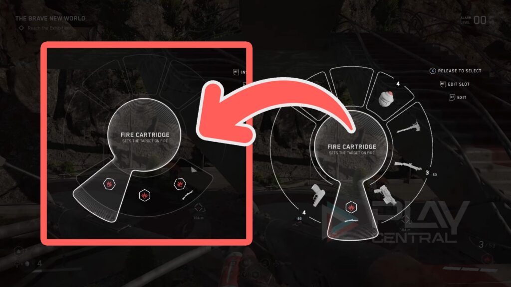 Wie kann ich eine Kartusche ausrüsten? Um jetzt eine solche Kartusche auszurüsten, benötigt ihr sie erst einmal in eurem Inventar. Nun müsst ihr das Schnellauswahlmenü öffnen. Das könnt ihr ansteuern, indem ihr auf der PS5 die Viereck-Taste oder auf der Xbox die X-Taste gedrückt haltet.