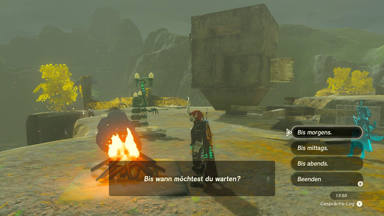 Ist das Lagerfeuer entfacht, stellt euch direkt davor und wartet bis zum frühen Morgen. Dreht den Quader via Winde nun so lange, bis der Schatten das weiße Symbol komplett abdeckt. Die Sonne steht dafür kurz vor 06:00 Uhr morgens perfekt, zwischen dem Erwachen am Lagerfeuer und dem richtigen Zeitpunkt liegen also nur wenige Momente.