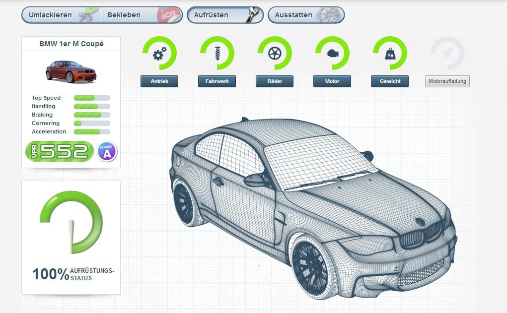 Spätestens seit Vin Diesel und Paul Walker in The Fast And The Furious die Leinwand zur Rennstrecke erklärt haben, kommt kein Rennspiel mehr ohne Tuning-Möglichkeiten aus. Allerdings brauchen Anfänger keine Angst haben vor einem Wald voller Autobäume zu stehen: Die Entwicklung eures Flitzers ist völlig geradlinig und ohne Stolpersteine. Das System ist dabei ganz leicht: Jedes Auto ist an denselben Stellen modifizierbar. Ihr könnt euren Motor zum Beispiel via Chip-Tuning verbessern, griffigere Reifen draufziehen oder Gewicht reduzieren – die Standards eben. Für jedes Tuning erhaltet ihr zusätzliche VPR für euer Auto, was dessen Leistungsfähigkeit steigert und euch den Zugang zu höheren Rennklassen ermöglicht. Spieler können nämlich die Teilnahme an eigens erstellten Rennen komplett über die VPR eingrenzen und damit zu gute oder zu schlechte Autos ausschließen. Für Profis sind die eher schwachen Möglichkeiten aber etwas mau und lassen keinen Spielraum für Experimentierfreudigkeit und Individualität. Dieses Feature ist deutlich für Einsteiger und Casuals ausgelegt.