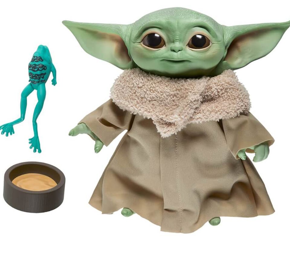 Eine der ersten Merch-Produkte, die zu Baby Yoda enthüllt worden, bezieht sich auf die elektronische Plüschpuppe von Hasbro. Sie ist rund 19 Zentimeter groß, kostet 29,99 Euro bei Zavvi (UVP 33,99 Euro) und erscheint am 30. Juli 2020 mitsamt einem Wüstenfrosch. Bei Amazon kostet sie 31,99 Euro, ist jedoch ab dem 1. Juni 2020 erhältlich.