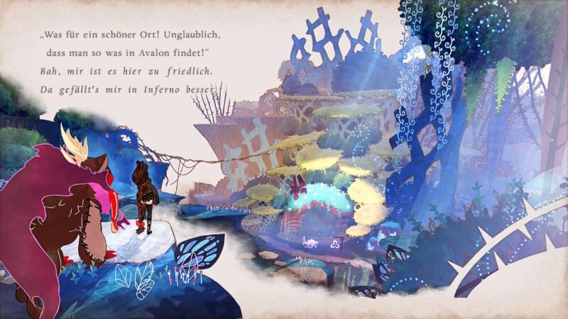 Auch wenn wir bis hierhin immer wieder mit dem Prequel-Game gemeckert haben, so konnte uns doch die Atmosphäre des Abenteuers schnell in ihren Bann ziehen. Die Geschichte wird wie ein Märchen erzählt, inklusive sich umblätternder Seiten eines Buchs. In Kombination mit dem wirklich bildhübschen Artstyle und den sehr guten englischen Sprecher*innen ließ uns das Spiel nicht mehr los.