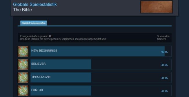 Für die ganz Schnellen: Ihr könntet die Bibel in puncto Achievements theoretisch sogar speedrunnen, wenn ihr einfach nur alle Schriften einmal öffnet. Oder ihr lest die Bibel in rund 70 Stunden durch. Das bleibt euch überlassen.