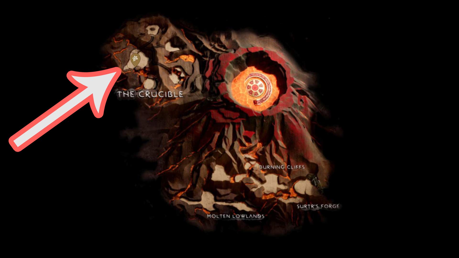 Sobald ihr den Schmelztiegel freigeschaltet habt, könnt ihr die Welt Muspelheim reisen. In der Nähe des mystischen Tors, durch das ihr ankommt, befindet sich Schmiedin Lunda. Direkt neben ihrer Werkstatt vor dem großen Felsen könnt ihr das Aschenblatt einsammeln.
