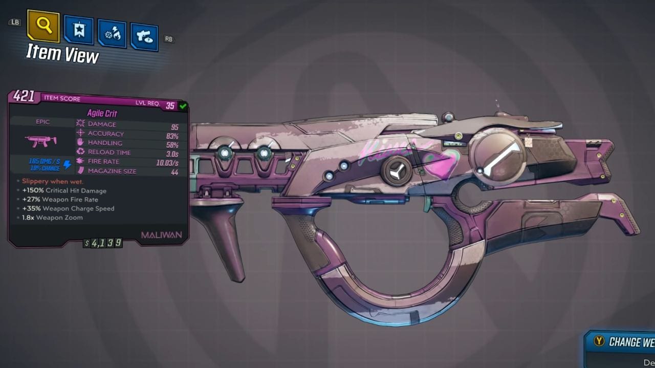 The Crit ist eine starke Maschinenpistole, die Schock-Schaden verursacht und somit besonders stark gegen Feinde mit Schilden ist und 150 % kritischen Schaden verursacht. Ihre besondere Eigenschaft „Slippery when wet“ sorgt allerdings mit einer zwölfprozentigen Chance dafür, dass ihr die Waffe beim Nachladen fallen lasst.