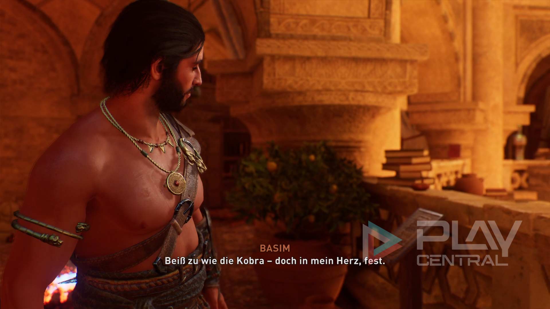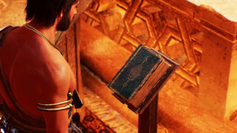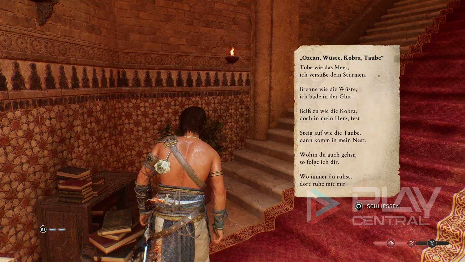 Steigt in dem großen Raum die Treppe hinauf und wendet euch den insgesamt vier Buchständern an dem steinernen Gelände zu. Ihr könnt mit jedem Pult interagieren und entweder eines der vier Bücher auswählen und dort ablegen oder das Gedicht von Basim ein weiteres Mal aufgesagt bekommen.