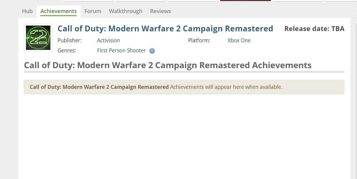 Außerdem findet sich seit Kurzem ein Eintrag für das Spiel auf der Website TrueAchievements für die Xbox One. Dieses listet „Call of Duty: Modern Warfare 2 Remastered“ allerdings als Remaster der Einzelspielerkampagne.