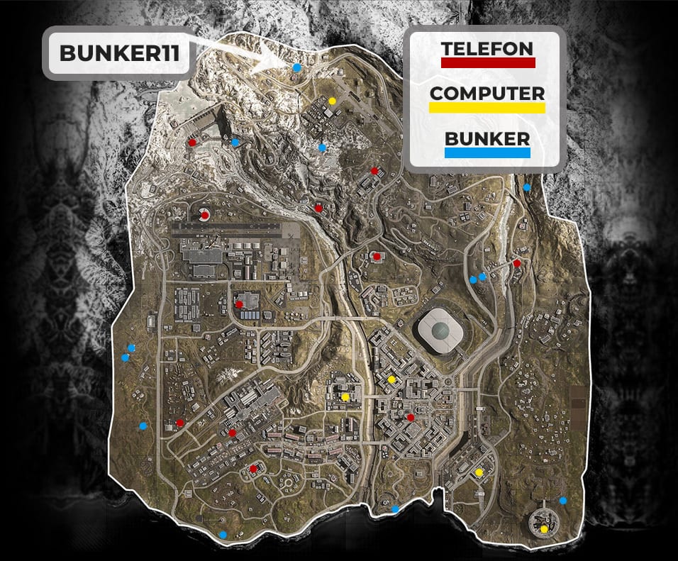 Hinweis: Auf der nachfolgenden Karte haben wir euch alle 11 Bunker, Telefone und Computer eingezeichnet. Bunker 11 befindet sich dabei ganz im Norden der Warzone-Karte und ist von uns extra mit einem Pfeil gekennzeichnet worden.