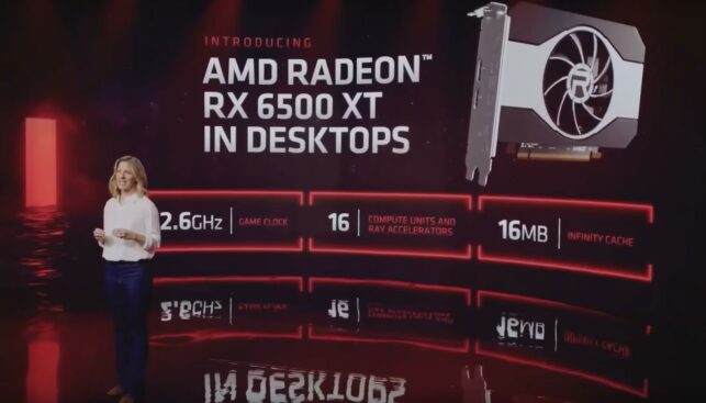 Firmenchefin Dr. Lisa Su vergleicht die Leistung der RX 6500 XT während der Präsentation mit der Nvidia Geforce GTX 1650 und der AMD Radeon RX 570. Der Neuankömmling soll beiden Karten in Sachen Spielen in Full-HD-Auflösung deutlich überlegen sein, wie mit einem Vergleichsdiagramm gezeigt wurde.