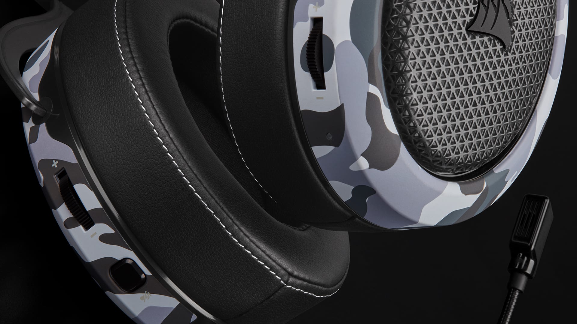 Das HS60 Haptic verfügt über eine sehr robuste Konstruktion mit Aluminiumbügeln, die aber nicht zu erkennen sind, da diese mit Kunstleder samt einem in weiß genähten Muster ummantelt sind. Dadurch entsteht ein sehr hochwertiger Eindruck, der von einem schwarzen Mesh, der die verbauten Treiber schützt, weiter verstärkt wird. Auf dem Mesh befindet sich ebenfalls in schwarz gehalten das Corsair-Logo.