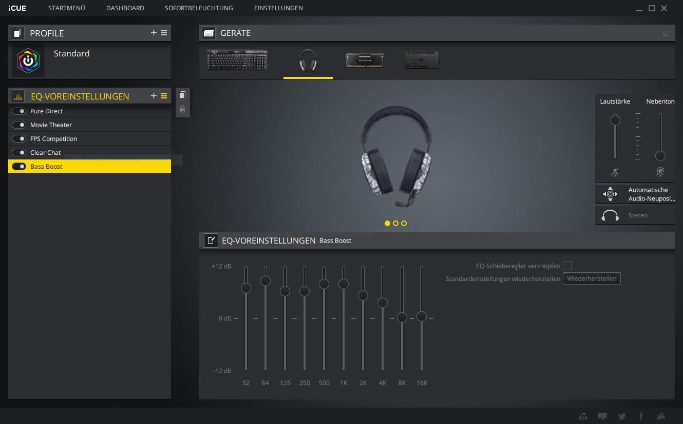 Eine RGB-Beleuchtung gibt es bei dem HS60 Haptic hingegen nicht. Entsprechend gering sind auch die Möglichkeiten, die euch in Corsairs eigener Software namens iCUE zur Verfügung stehen. Hier könnt ihr lediglich zwischen einigen EQ-Voreinstellungen wählen oder die Soundabstimmung selbst übernehmen und die Schieberegler individuell verschieben.