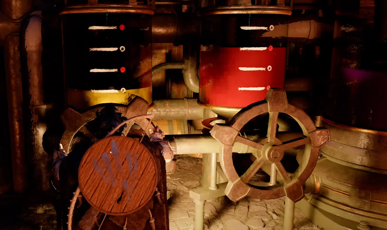 Wie produzierst du die perfekten Elixierflaschen? Geh von der Mischmaschine aus nach links durch den Torbogen und nimm eines der großen Öl-Fässer auf. Trage es zurück Richtung Treppe. Rechts neben der Treppe findest du eine Maschine, in die du das Fass einsetzen kannst.